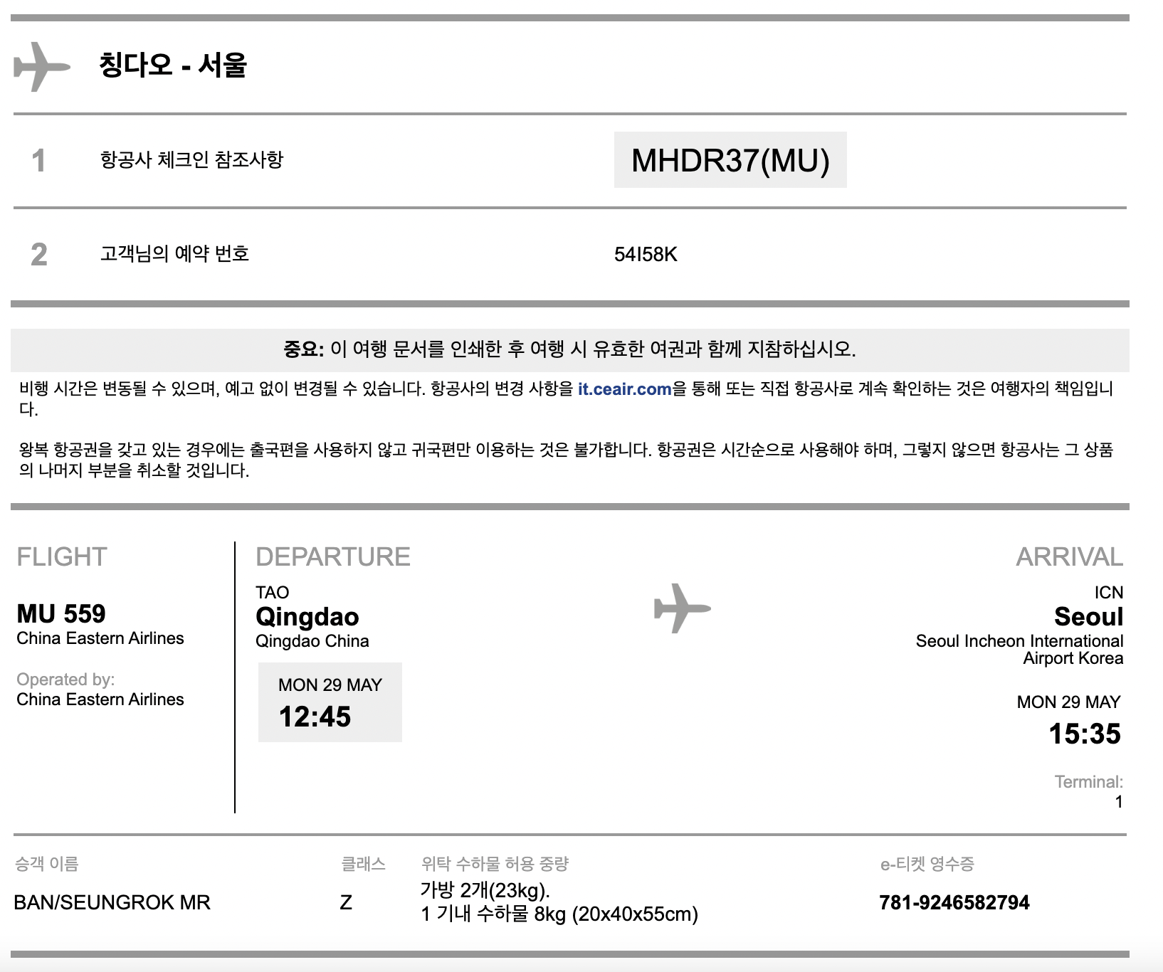 - 비행기 왕복 티켓 1장, 숙박 호텔 바우처 1장(영어 스펠링으로 된것)